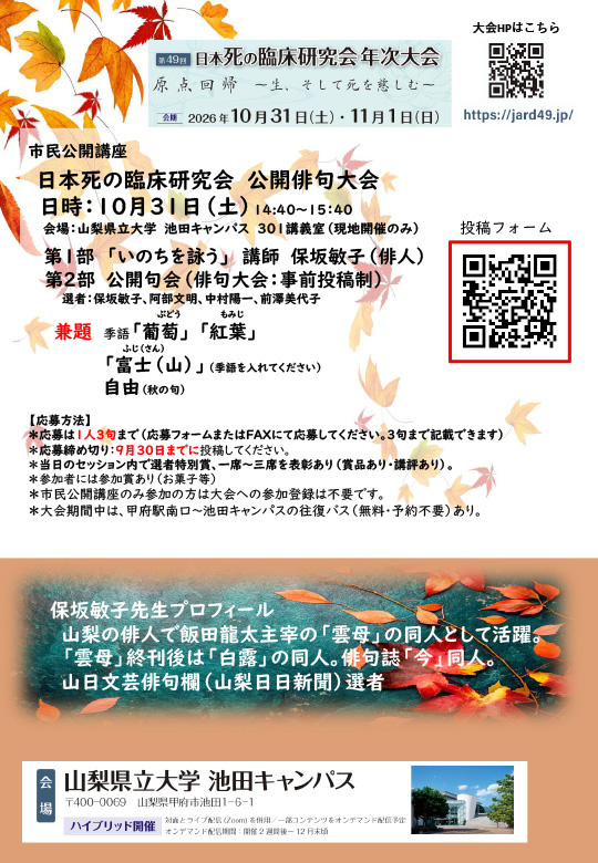 「日本死の臨床研究会 市民公開講座」にて開催予定の、公開俳句大会にて発表する俳句を募集しています。詳細および応募方法をご確認の上、奮ってご応募ください。